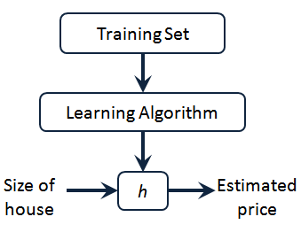 使用训练数据集和选择的训练算法,来计算假设函数 h 的参数,使得给定一个输入,假设函数给出一个预测的输出。比如预测房屋价格: