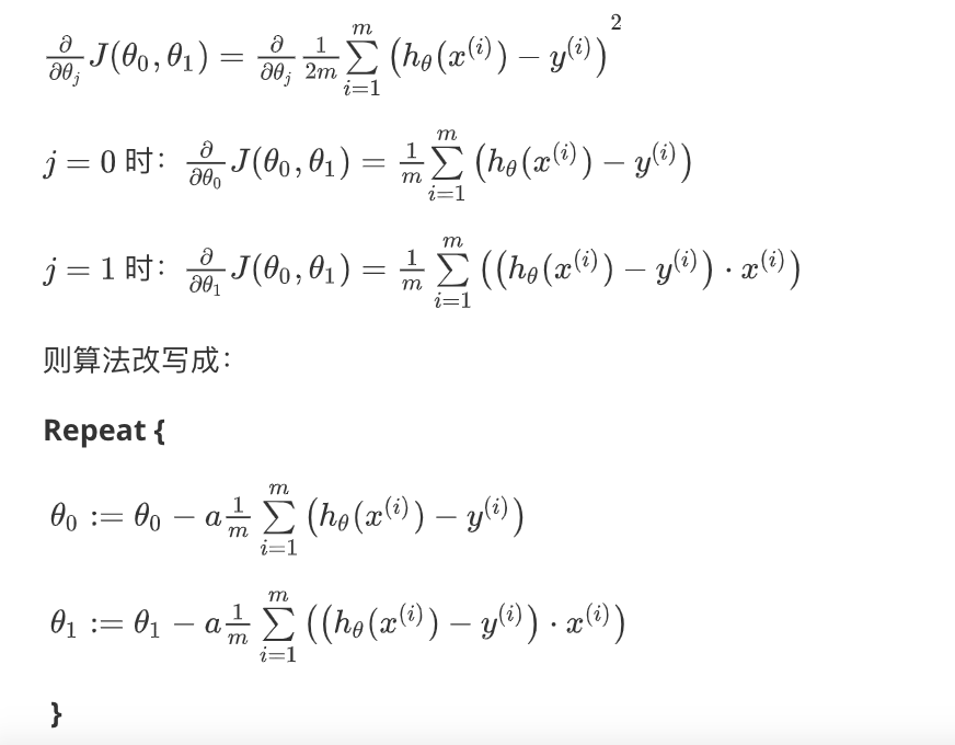 当你理解了梯度下降算法的公式后,便可以看出求解的关键点就在于求出代价函数关于参数 theta_i 的偏导数,求偏导是高数中很基础的方法,这里就不介绍了,直接看下求出的 2 个偏导数: