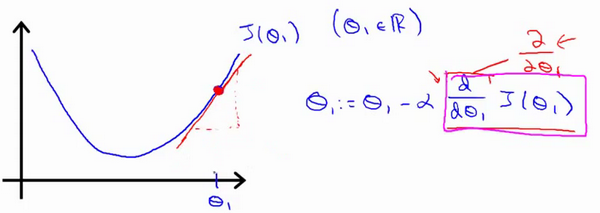 为了方便理解,上面的代价函数假设 theta_0 = 0,红色的直线线表示 theta_1 点的切线,切线斜率即右端的红框中的对 theta_1 的偏导数,且切线的斜率大于 0。