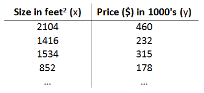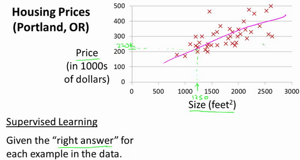 比如用监督学习来根据房屋面积预测房价,那么在训练数据集中每个房屋面积都对应一个确定的价格(750, 200)。