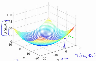 上面一个参数 theta_1 的代价函数容易理解,如果是两个参数的 J(theta_0, theta_1) 的代价函数,函数图形稍微复杂些,不过也不是很难。
