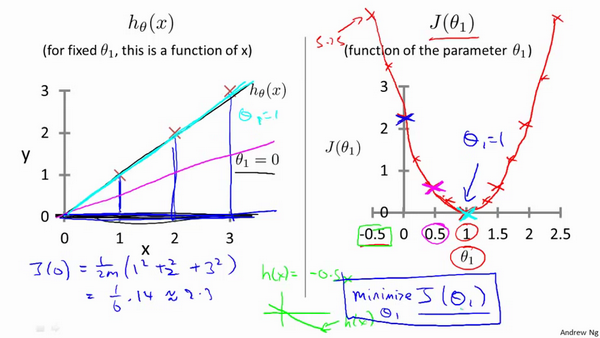 这时误差达到最小,对应的函数参数为 theta_0 = 0,theta_1 = 1,这就是训练的最终结果了。