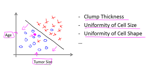 红×和蓝圈代表两种不同类型,中间的直线是我们算法预测的分类边界函数。