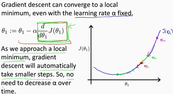 在上图中随着算法不断迭代,更新的数据点越来越接近曲线底部,相对应的切线也越来越缓,即学习率 a 会自动变小。