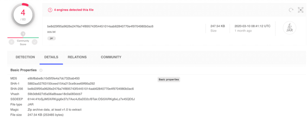 更令人不安的是,Octopus Scanner 很难被检测出来,GitHub 向 VirusTotal 上传了样本,60 个杀毒软件只有 4 个能将其检测出来。恶意软件伪装成了 ocs.txt 文件,但实际上它是一个 JAR(Java Archive)文件。