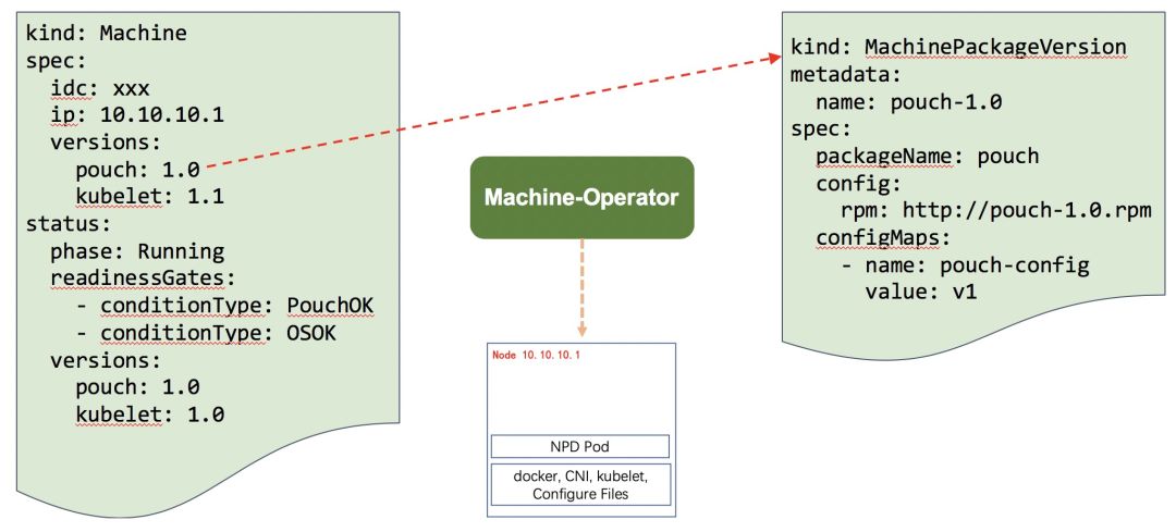 Machine-Operator watch Machine 资源,解析 MachinePackageVersion,在节点上执行运维操作来驱动节点达到终态,并持续守护终态。