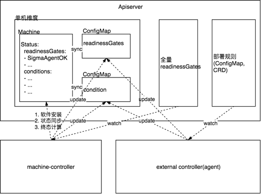 Machine-Operator 根据全量 ReadinessGates 中记录的 Condition 列表,检查节点是否达到终态,未达到终态的节点不开启调度。