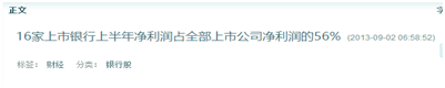 在中国2013年的时候统计,16家上市银行上半年的净利润占全部上市公司利润的56%,因为企业都在用银行的钱,而且银行的利润算是便宜的,平均年息在10%以内。