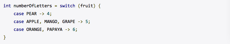 使用Java 12,switch不仅可以作为语句也可以作为表达式。 无论作为语句或者作为表达式,switch都可以使用传统/简化的作用域和控制流行为。 这将有助于简化代码,并为在switch中使用模式匹配铺平道路。