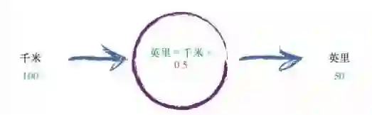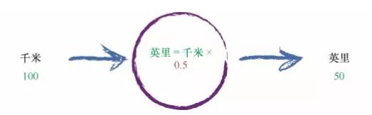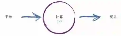 让我们稍微增加一点复杂度。 试想一下将千米转化为英里的一台机器,如下所示。