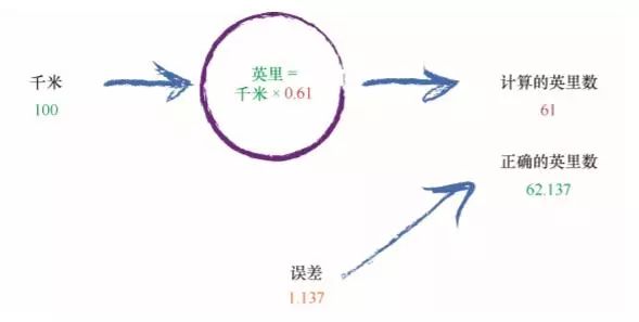 再看看这个误差值。我们少了12.137。由于千米转换为英里的公式 是线性的,即英里= 千米 ×C,因此我们知道,增加C 就可以增加 输出。