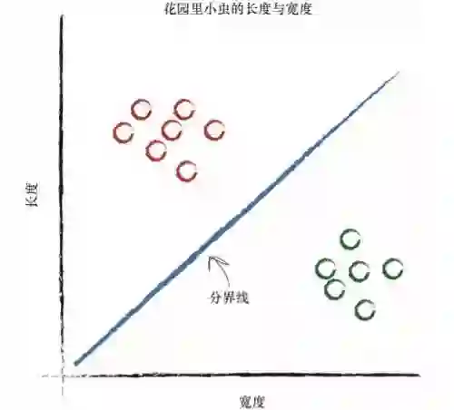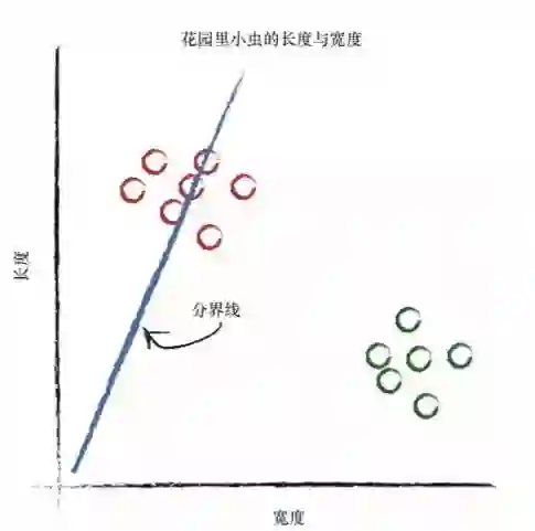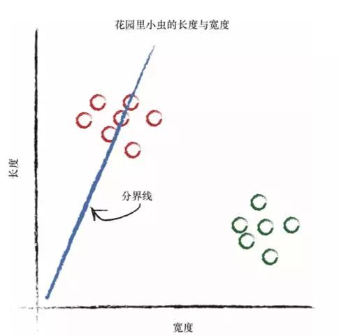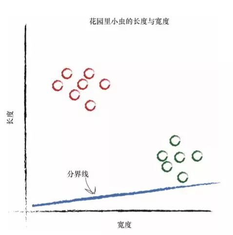这条直线好多了!这条直线整齐地将瓢虫与毛虫区分开来了。现在, 我们可以用这条直线作为小虫的分类器。 我们假设没有未经发现的其他类型的小虫,现在来说,这样假设是没有问题的,因为我们只是希望说明构建一台简单的分类器的思路。