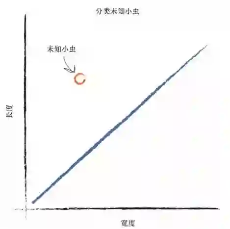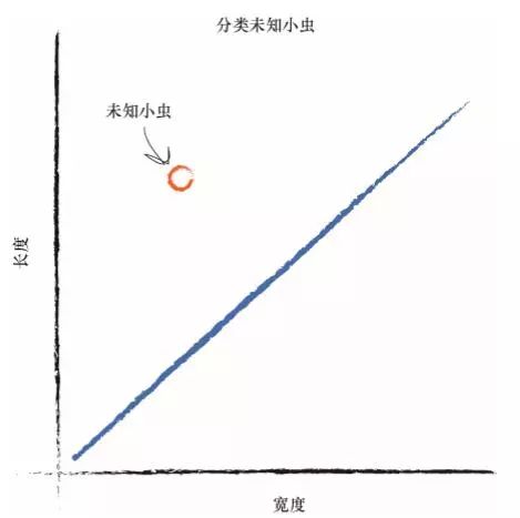 设想一下,下一次,计算机使用机器手臂抓起一只新的小虫,测量其宽 度和长度,然后它可以使用上面的分界线,将小虫正确归类为毛虫或瓢虫。 看看下图,你可以看到未知的小虫位于直线之上,因此这是一条毛 虫。这种分类非常简单,但是非常强大!