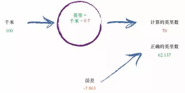 这台机器得到 50 英里的答案。 嗯,鉴于我们随机选择了 C = 0.5,这种表现还算不错。但是,编号为 2 的真实示例告诉我们,答案应该是 62.137,因此我们知道这是不准 确的。 我们少了 12.137。这是计算结果与我们列出的示例真实值之间的差值,是误差。即:
