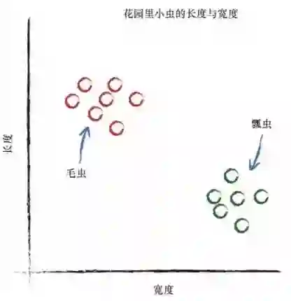 因为上述的简单机器接受了一个输入,并做出应有的预测,输出结 果,所以我们将其称为预测器。我们根据结果与已知真实示例进行比较所 得到的误差,调整内部参数,使预测更加精确。 现在,我们来看看测量得到的花园中小虫子的宽度和长度。