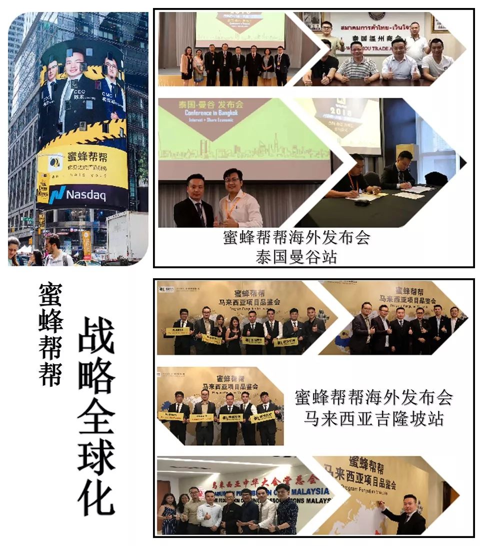 2018年7月13日,蜜蜂帮帮CEO陈龙先生带队在泰国曼谷召开了首场海外发布会,为蜜蜂帮帮海外布局打响第一站。同年11月7日,蜜蜂帮帮再次进行海外市场布局,登陆马来西亚市场,并获得当地政府与企业的大力支持并取得圆满成功!