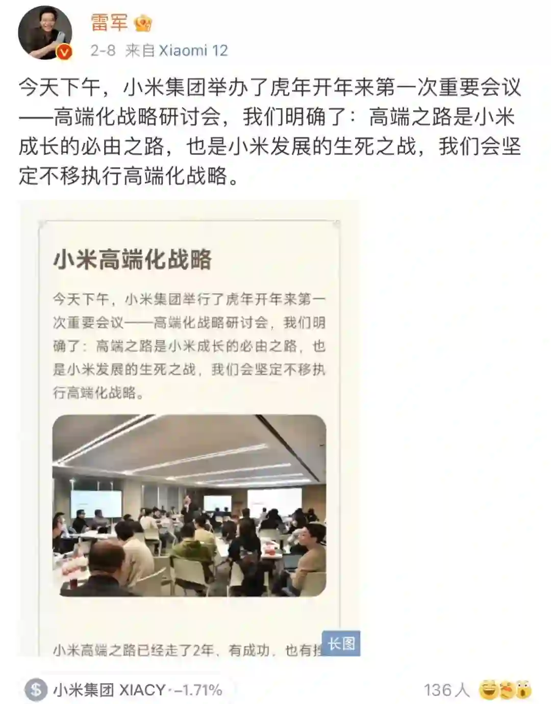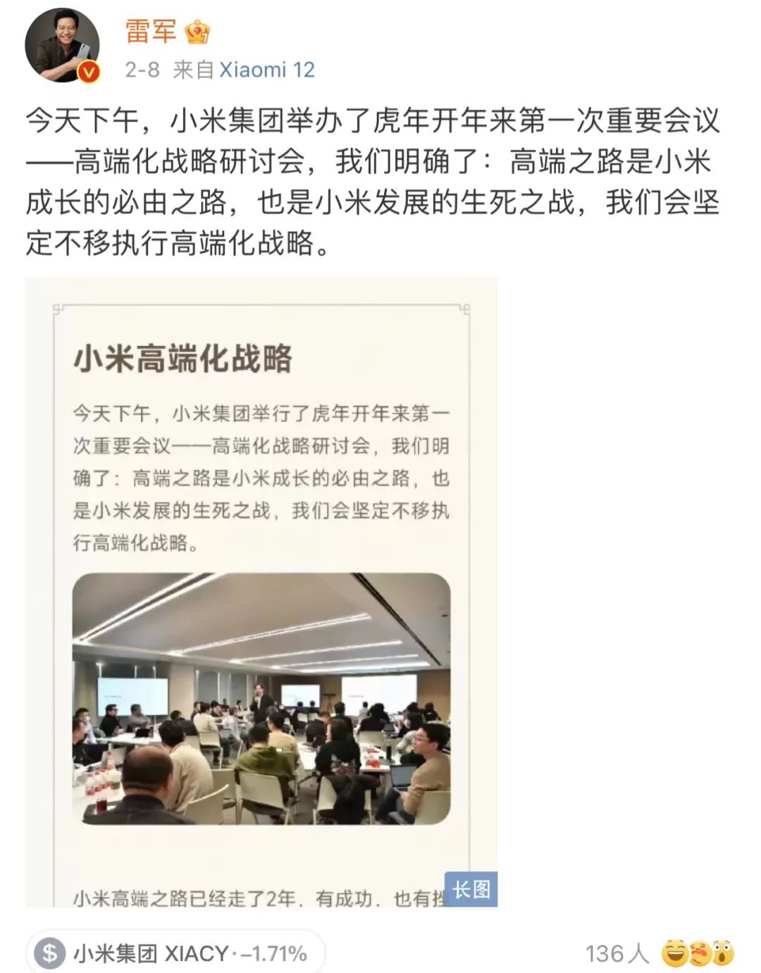 虎年开工第二天的2月8日,雷军在微博发文称,小米集团成功举办虎年首场重要会议——高端化战略研讨会。