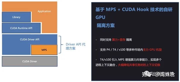 百度推出的GPU共享方案[9]也是一个CUDA劫持方案,通过经典CUDA劫持限制显存,在算力隔离方面使用了MPS。没有开源代码。MPS在限制算力方面,除了众所周知的错误影响问题,其实算力限制并不严格,且无法根据GPU状态灵活调节算力的限制。期待下一代方案。