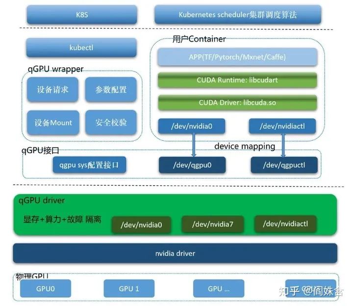 腾讯在内核劫持类GPU共享方向上,也推出了资源隔离方案qGPU(qos GPU)[8]。从架构图中就可以看出,qGPU和同属于内核劫持方案的cGPU类似。但值得注意的是,qGPU效仿Nvidia vGPU在必要时context switch,实现了强算力隔离,这也是其名字的由来。出于某些考虑未有开源。
