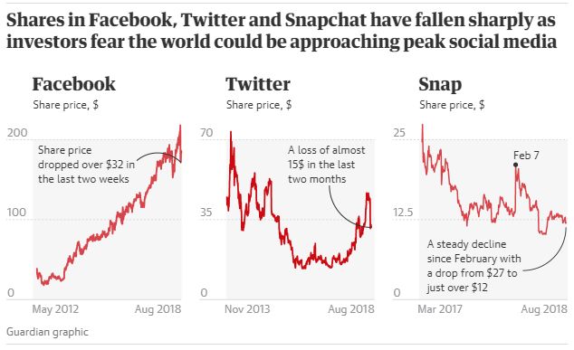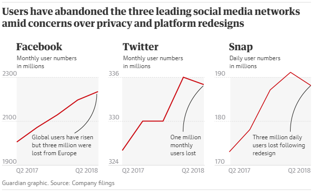 对比 Facebook 和 Twitter 在面对隐私泄露和外部监管等等危机而笼上的阴霾,《卫报》和《纽约时报》分别刊文提出了疑问:社交媒体的增长是否已经到达了顶峰?