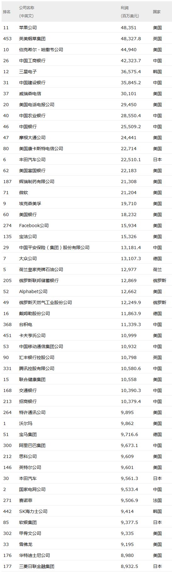 3、世界500强利润榜:苹果第一 腾讯阿里上榜