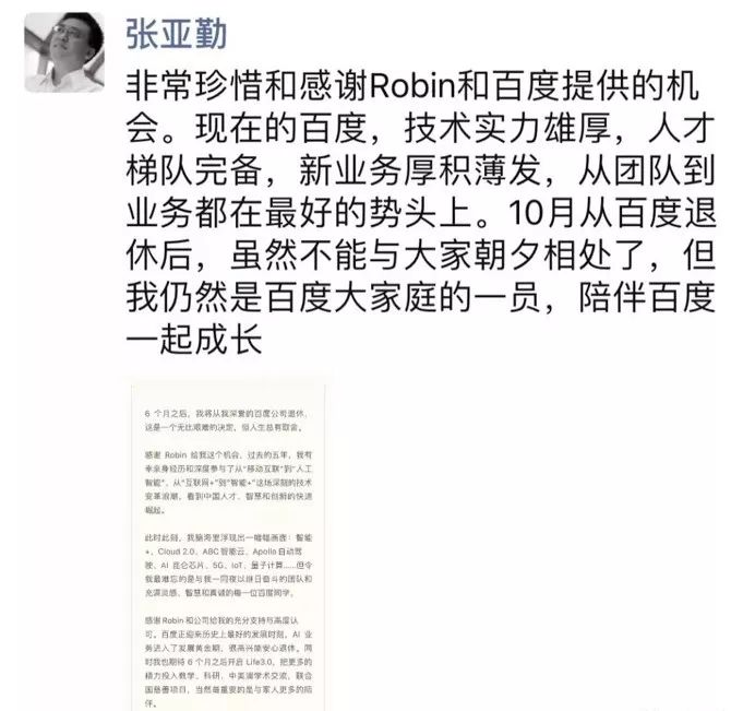 在过去几年间,亚勤和家人不在一个城市,陪伴的时间很少,在多年投入地工作之后,他希望可以更多地和家人在一起。在此我们理解并同意亚勤的选择,感谢他过去的辛勤奉献,并祝福他未来生活美好、身体健康、阖家幸福。亚勤永远都是百度大家庭的一员!我也想借此机会,感谢所有辛苦付出、做出贡献的百度同学,感谢每一位曾经在百度公司工作过的同事。