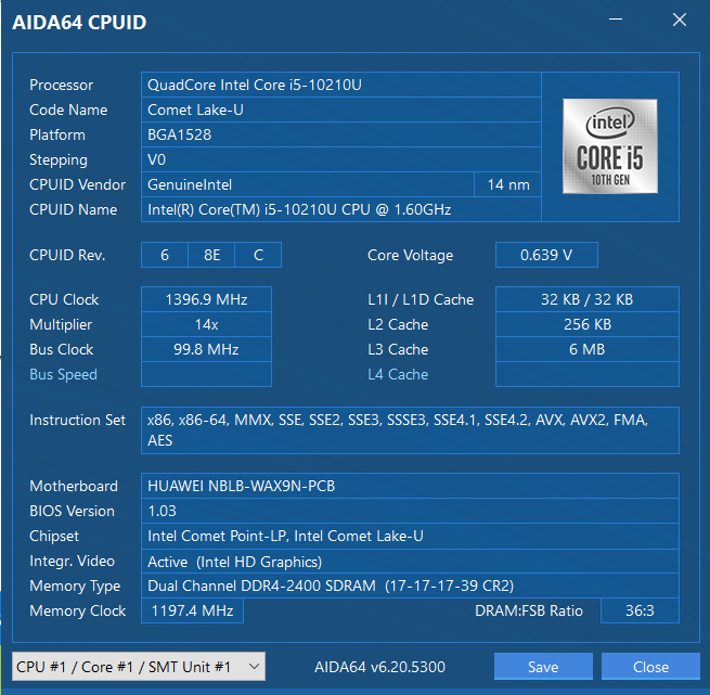 i5-10210U 属于 CometLake,单核最大频率和全核最大频率分别是 4.2GHz 和 3.9GHz,高于 i5-8265U 的 3.9GHz/3.7GHz。下面通过使用几款跑分软件进行测试,并以另一款搭载 i5-8265U 的笔记本对比,看看 i5-10210U 的表现。