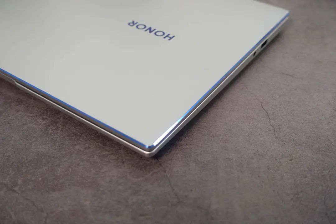 作为一名颜值控,产品的外观往往也是我关注的要素之一。荣耀笔记本 14 采用一体化全金属机身,设计简约,质感不错。最吸引人眼球的,还是 A 面周围的那一圈钻切蓝边,再配合同样是蓝色的荣耀 Logo,为笔记本的颜值增色不少,彰显出年轻时尚的个性。