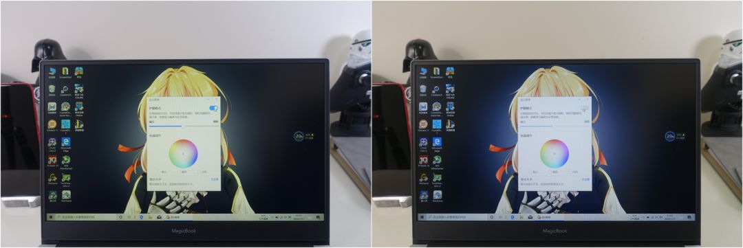 荣耀笔记本 14 屏幕还通过了德国莱茵低蓝光认证,提供护眼模式,可以在系统中开启。开启护眼模式后,屏幕会偏黄一些,长时间阅读屏幕时,有助于防止用眼疲劳。