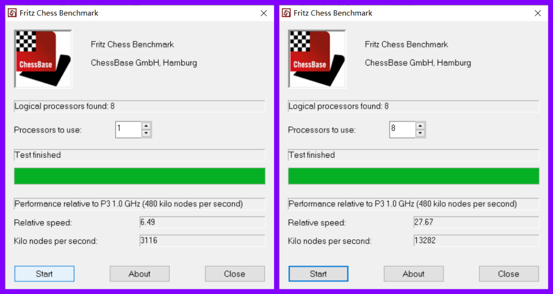 首先,使用国际象棋测试,结果如下:i5-10210 U的单线程成绩为 3116,多线程成绩为13282;i5-8265U 的单线程成绩为 2657,多线程成绩为 11050。