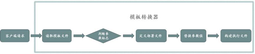 模板转化器是模板引擎的核心,重点解决三个问题:获取部署模板,参数与值转换,构建可执行文件。客户端把模板解析器中参数赋予真实值,传递到服务端,服务端读取模版内容,遇到参数的标志位结束,把读取的内容通过文件流写到新文件,生成部署文件,接着用参数值对部署文件中的参数做关联替换,生成最终的可执行文件。模板转化器的工作原理如图3所示:
