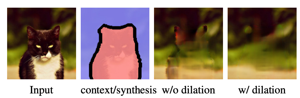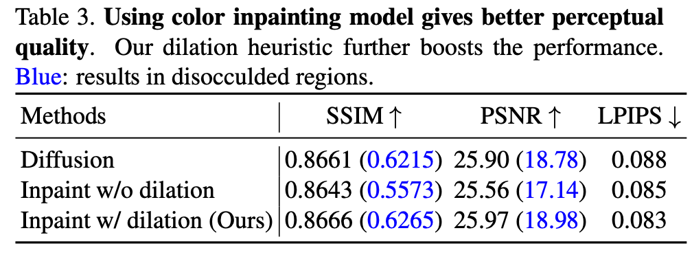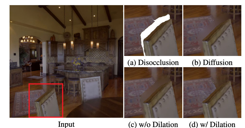此外,由于检测到的深度边缘可能无法与遮挡区域的边界很好地对齐,因此研究者将合成区域扩大了 5 个像素,这有助于减少修补区域中的伪影。