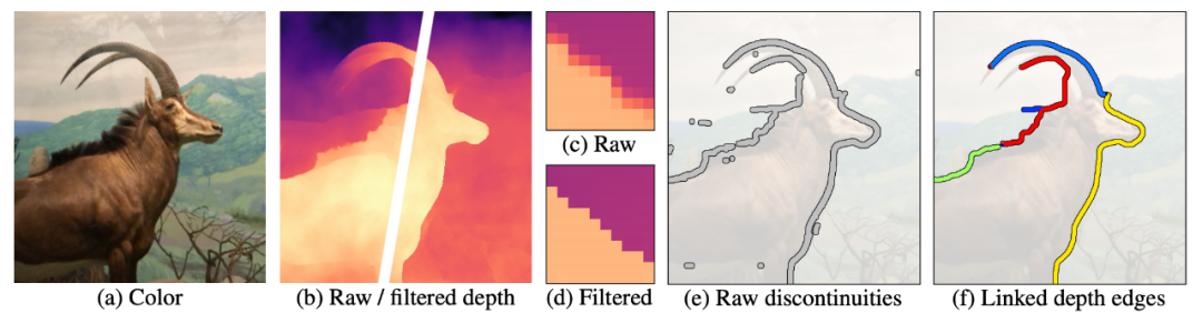 下图 2 展示了图像预处理的过程。首先对颜色和深度输入进行预处理 (a-b),然后使用双边中值滤波器锐化输入深度图 (c-d),接下来使用视差阈值检测不连续区域 (e),清除错误的阈值响应并将不连续区域组合成为连接深度图 (f)。这些连接深度图正是修复过程的基础。