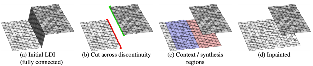 图 3:LDI 修复算法的概念图示。(a) 初始 LDI 是全连接的,图中灰色区域是深度边缘(不连续区域)。(b) 首先将深度边缘上的 LDI 像素连接断开,形成前景轮廓(绿色)和背景轮廓(红色)。(c) 对于背景轮廓,提取语境区域(蓝色),生成合成区域(红色)。(d) 将合成像素并入 LDI 中。