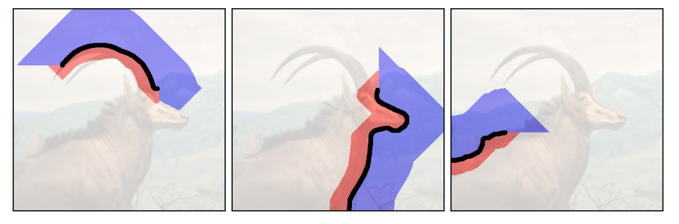 图 4:语境/合成区域。图 2(f) 中三个连接深度边缘示例(黑色)的语境区域(蓝色)和合成区域(红色)。