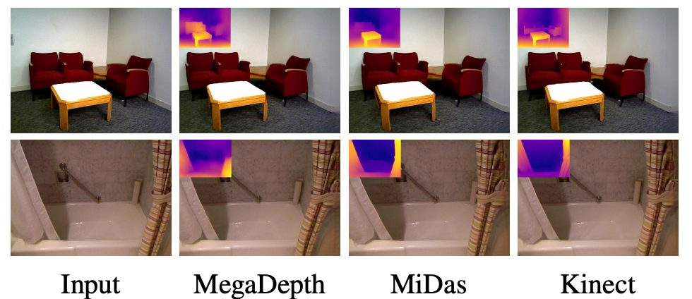 图 12:该研究提出的方法可以处理不同来源的深度图。新视角图像左上角为深度估计。