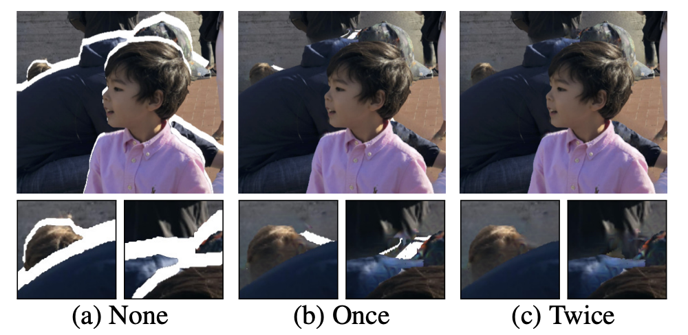 下图 8 展示了多次应用修复模型的效果。其中,应用一次修复模型填补了缺失的层。但是从图 8b 的观察视角中,我们依然可以看到一些空白区域。而应用两次修复模型可以彻底消除这些伪影。