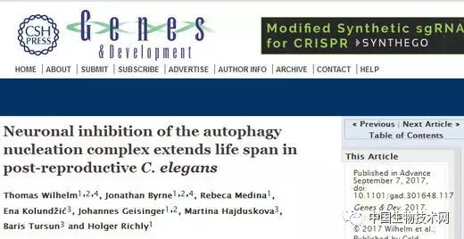 这个星球上所有的物种都会变老,这是为什么呢?这篇名为"Neuronal inhibition of the autophagy nucleation complex extends lifespan in post-reproductive C. elegans"的研究中,IMB的Holger博士首次发现了一些能够解答这一问题的基因证据。