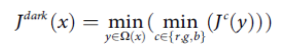 利用暗通道的概念发现了单个模糊图像的传输,暗通道假设所有室外图像中至少有一个颜色通道存在为零或极低的像素。对于无雾图像 J,暗通道是: