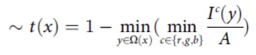 其中 Jc 是 J 的颜色通道之一,Ω(x) 是集中在 x 附近的局部图像块。利用天空或最亮区域可以估计出 airlight,所以可以得到传输: