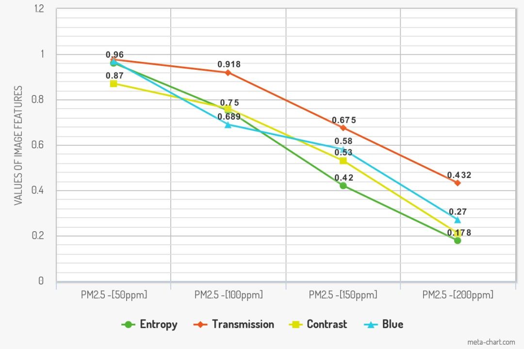 其中 pi 是像素强度等于 i 的概率,M 是图像的最大强度。随着 PM 浓度增加,图像逐渐失去其细节,并且图像熵降低。因此,它与 PM 2.5 成反比关系。