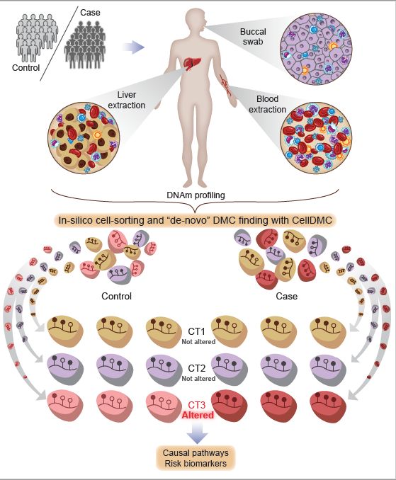 DNA甲基化(DNAm)是DNA的共价修饰,其可以调节基因活性,并且易受到疾病风险因子的影响。表观全基因组关联分析(EWAS)的主要目标是测量大量个体中全基因组DNA甲基化,鉴定与疾病风险相关的DNA甲基化变化。然而,这一过程的主要障碍之一是细胞类型异质性:EWAS所使用的组织是不同细胞类型的复杂混合物,每种细胞类型具有其特有的DNA甲基化谱,因此可能产生错误的分析结论。到目前为止,尚无有效手段来确定驱使DNA甲基化发生变化的细胞类型和表观遗传通路。