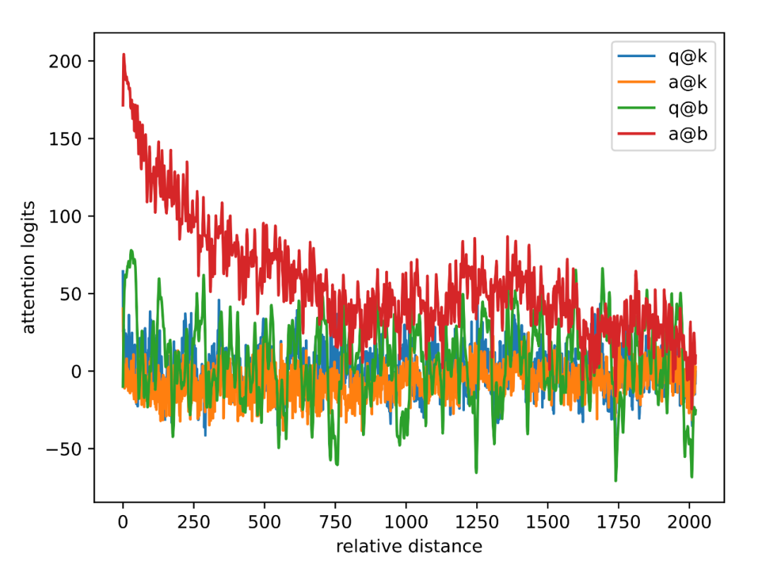 这个加性相对位置编码其实之前也留意到了,但当时的评价只是“不理解为什么同时用几种位置编码”,而最近笔者一直在思考长度外推性问题,所以对这个形式就比较敏感了。
