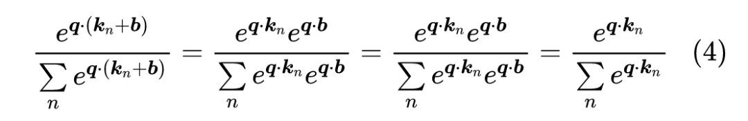 ,事实上,“可以去掉 Key 的 Bias”这个结论,是针对没有 RoPE 的 Attention 的,由于 Softmax 的存在,加上的 bias 可以约掉: