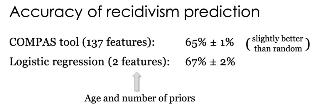 这一结果并非个例。在一项再犯罪率的预测研究中(论文链接见文末),AI的预测准确率只比随机结果好一点点,还是比逻辑回归的结果低了2个百分点。