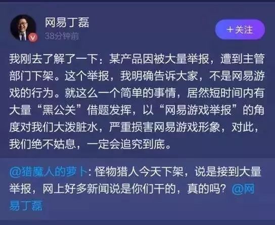幸好猪厂厂长直接回应了:“我明确地告诉大家,不是网易游戏的行为。就这么个简单的事情,居然短时间内有大量黑公关借题发挥,以网易游戏举报的角度对我们大泼脏水,严重损害网易游戏形象,对此,我们绝不姑息,一定会追查到底。”