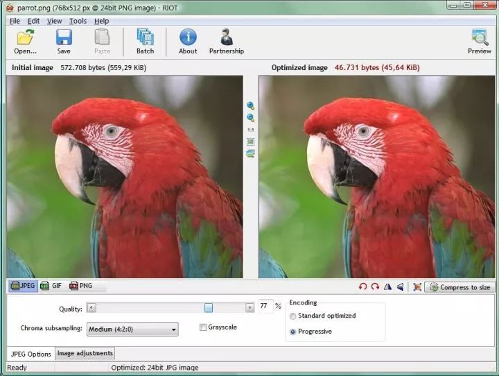 RIOT 有一个非常方便的界面,以供你实时比较「原图」和「优化后的图」,同时也可以实时看到优化后的图片体积。Riot 使用起来非常轻量、快速以及简单,然而对于深度用户而言,又不失强大。
