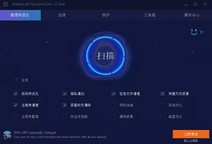 Advanced SystemCare 是一款出自 IObit 之手的优秀系统优化软件。提供了清理优化、系统加速、简单的系统保护等功能,界面简单干净,清理速度快。Free 版本就能完成大部分清理工作,并对常用功能进行优化。