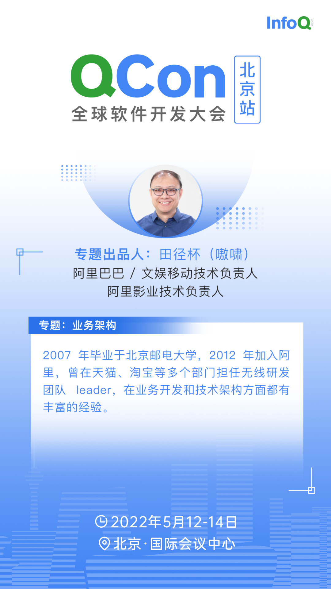 此次,我们邀请了阿里巴巴文娱移动技术负责人、阿里影业技术负责人田径杯(嗷啸)担任专题出品人。在沟通专题方向与内容设置时,嗷啸认为,好的业务架构需要从业务特性、团队组织架构、当前技术能力等多个角度综合考虑,设计出贴合业务需要,并且能够为业务发展赋能的整体性技术方案。
