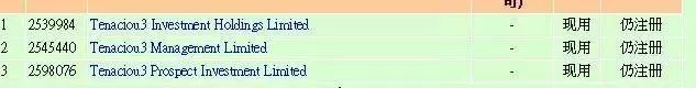 与这家成立仅4个月的公司前后时间段注册的,还包括注册于2017年5月29日的Tenaciou3 Investment Holdings Limited,注册于2017年6月15日的Tenaciou3 Management Limited。